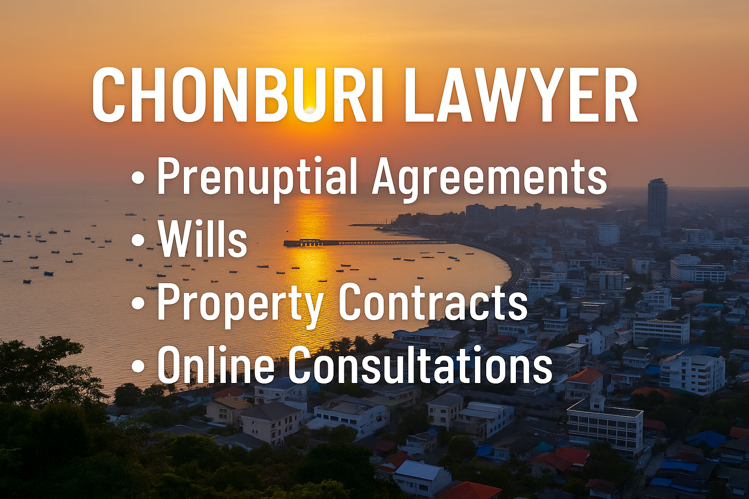 Sunset view of Chonburi coastline with boats, pier, and city buildings, overlaid with legal services offered by ThaiLawOnline including prenuptial agreements, wills, and property contracts