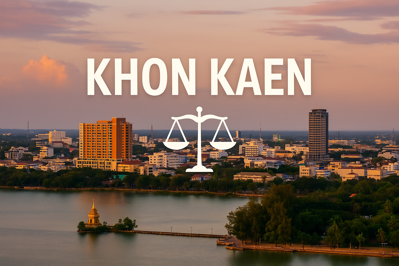 Cityscape of Khon Kaen at sunset with Bueng Kaen Nakhon lake, a golden pagoda, and a justice scale icon representing legal services in the region