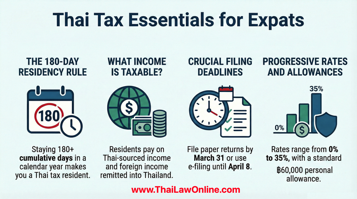 Understanding personal income tax in Thailand is essential for every expatriate living in the Kingdom. Whether teaching English in Bangkok, running a business in Phuket, or retiring with a Thai spouse in Isaan you need to know. The Thai tax system directly affects financial planning and legal compliance. This comprehensive guide covers everything from tax residency rules to the 2024 foreign income remittance changes, deductions, filing procedures, and tax-saving strategies.